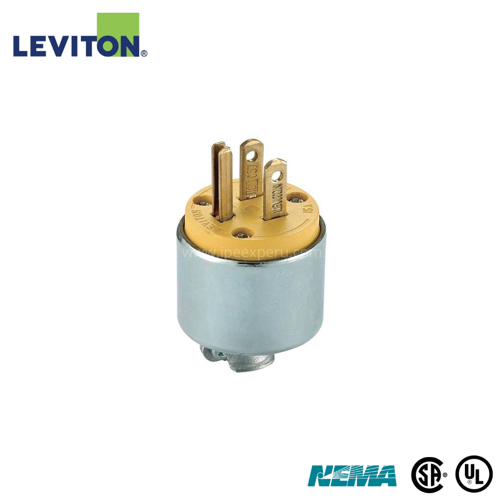 El enchufe plano blindado modelo 515PA está diseñado para aplicaciones eléctricas de 2 polos más tierra (2P+T), operando a 125/250 voltios con una capacidad de 15 amperios. Cumple con la norma NEMA 5-15P, lo que lo hace compatible con tomacorrientes NEMA 5-15R.